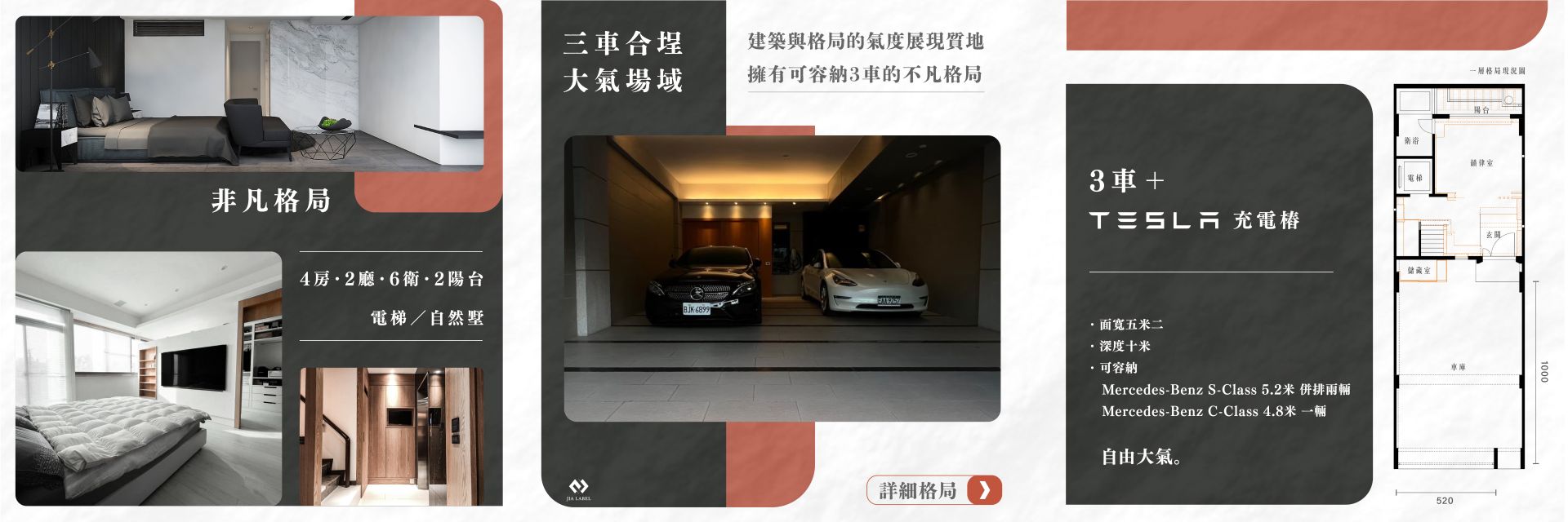 文案說明簡潔明瞭,直接點出建案的特色和銷售訴求,以「參車」點出大面寬,再用具體地坪、建坪將本案大空間的優勢清楚帶出。